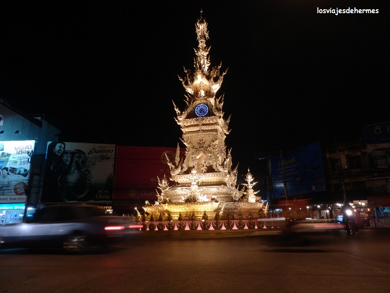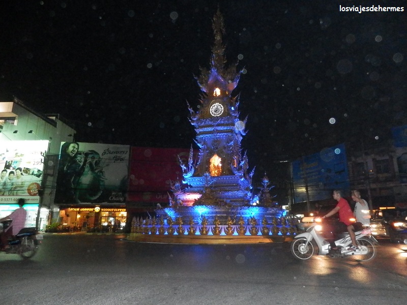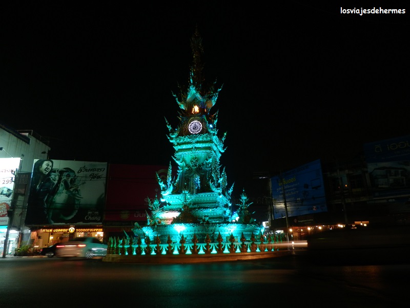 Nos detuvimos en la torre del reloj (en una rotonda) la cual estaba iluminaba de un color determinado (creo que era azul en ese momento) y a las horas en punto cambiaba de tono al son de la música creando un agradable espectáculo, además tuvimos suerte y justo al llegar se produjo uno de los cambios, que duraría un cuarto de hora por lo menos. Regresamos al mercado nocturno y más concretamente a su zona de restauración, una plaza llena de sillas y mesas rodeada de un montón de puestos con diferentes tipos de comida, decantándonos por unos pinchos y una fritura que costó 120 THB=2,98 € con la bebida.