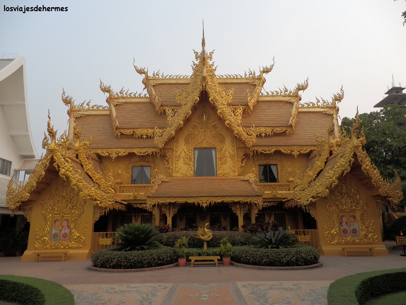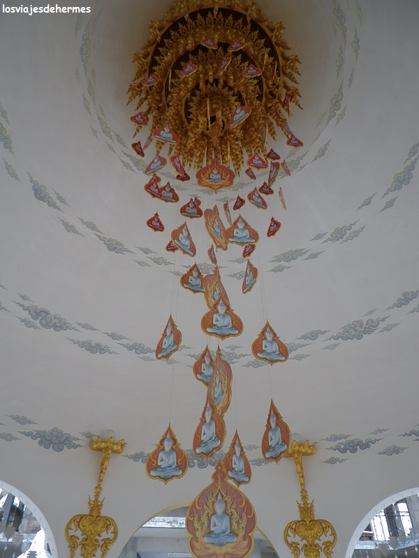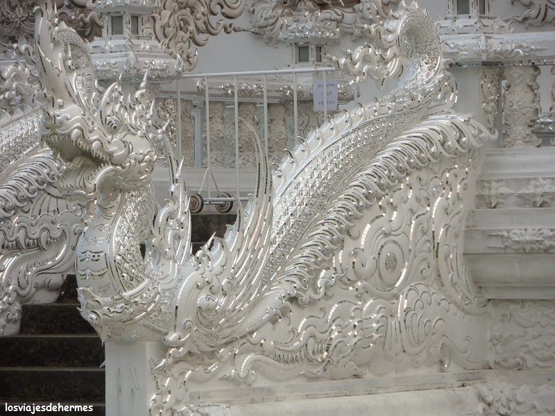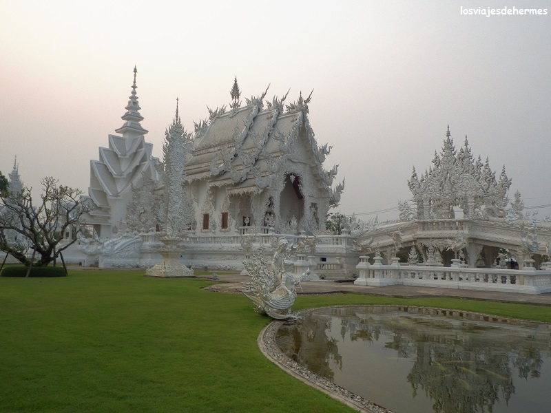 La primera visión del Wat Rong Khun es una pasada, parece salido de un cuento y no se parece en casi nada a cualquier otro templo de los que visitamos, es único, esa tarde había un poco de bruma que contrastaba con su resplandor blanco y estábamos prácticamente solos al ser ya casi la hora del cierre (5 de la tarde), pero por contra ya no pudimos acceder al interior del edificio principal que además estaba en obras según un cartel, rodeando igualmente el templo y disfrutando de otras zonas que son de libre acceso.