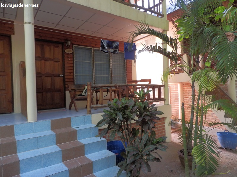 Serían un par de horas las que estuvimos navegando con buena mar, buen día también y vídeos con bromas para amenizar el viaje, llegando hacia las 9 de la mañana con la intención de ir a “tiro hecho” al resort “Tropicana”, del que una pareja de Bilbao que conocimos en Bangkok dos días antes nos había hablado muy bien. Está al sur de la isla en la bahía Chalok Baan Kao por lo que necesitamos un taxi (son camionetas) que nos costó 200 THB=4,99 €, quedándonos sin dudarlo en el “Tropicana” que tenía buen aspecto y precio, en una habitación doble con baño, toallas, ventilador, porche con terraza, wifi, estaba muy cerca de la playa y tenía un restaurante propio, todo ello a 400 THB=9,94 € la noche.