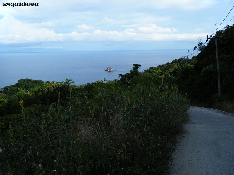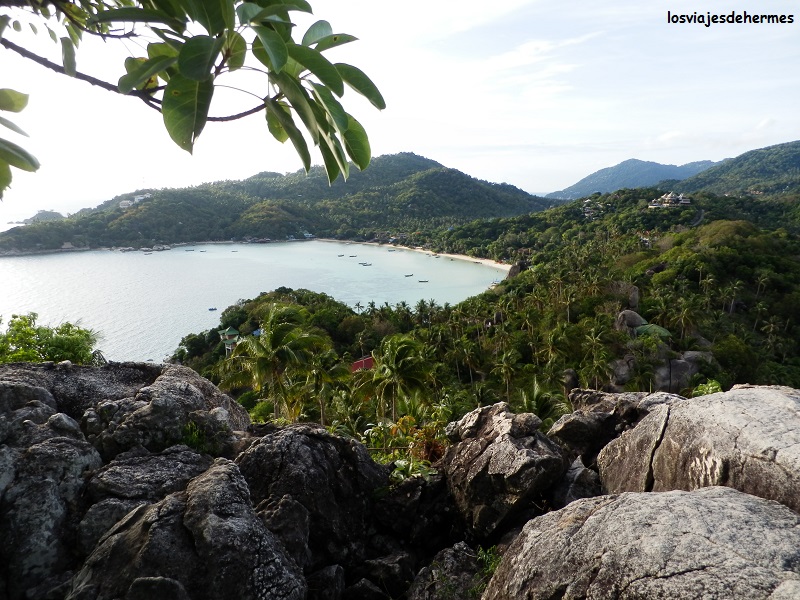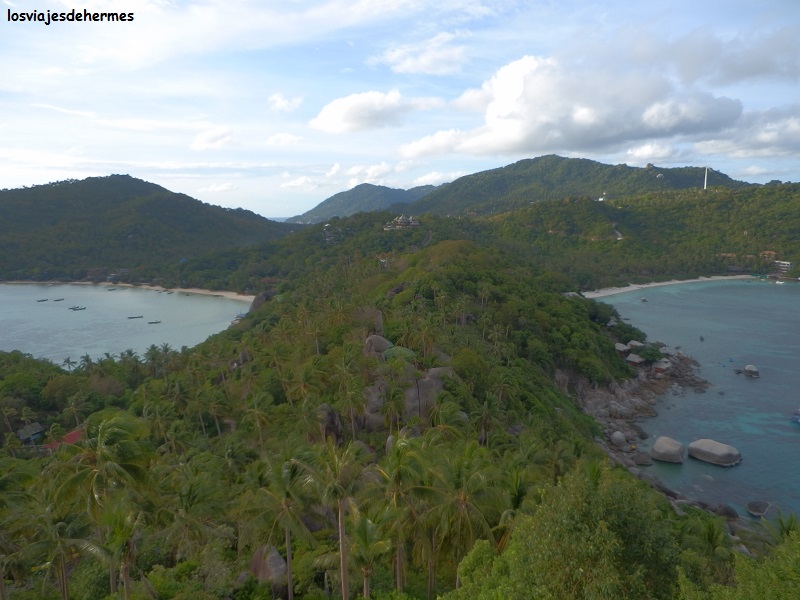 Ya con la moto repostamos a 44 THB=1,09 € el litro de gasolina y nos dirigimos al muelle de Mae Haad a comer (240 THB=5,99 € los dos) primero y a Tanote Bay después (que queda al este de la isla), bajando por unas cuestas muy empinadas con vistas al mar en las que hay que ir con cuidado. El día se iba despejando, lo que hizo que disfrutáramos más del buceo junto a unas rocas que hay en esta bahía, observando y fotografiando los bancos de peces entre los arrecifes, corales y demás hasta cansarnos (nos pegamos un buen rato). Subimos la cuesta de regreso aún con más precaución si cabe (la moto se portó bien) siguiendo la carretera principal al sur hasta el final (Freedom Beach resort), donde aparcamos para hacer una breve caminata hasta el John-Suwan mountain viewpoint, o lo que es lo mismo un sitio despejado en alto desde el que hay una preciosa vista de la península que separa las bahías Thian Og y Chalok Baan Kao, sin duda merece la pena acercarse hasta aquí y sólo lleva unos 15 minutos como mucho.