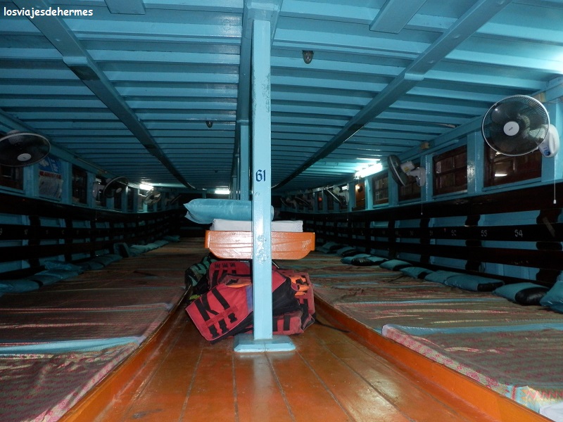 A las 7 de la tarde estaba puntual el taxi que nos llevaría al puerto y que entraba en el paquete contratado, esperando hasta las 9.30 que salía el ferry mientras comíamos algo por allí. El barco era de lo más curioso que yo haya visto, entendí por qué lo llamaban barco-cama en vez de ferry, ya que se trataba de una embarcación más bien vieja que tenía una cubierta corrida llena de colchonetas a ambos lados numeradas, sin mucho espacio entre ellas. Por suerte no iba mucha gente y pudimos estar a nuestras anchas. Nos familiarizamos rápidamente con el barco que salió puntual, no tardando mucho en acostarnos en las colchonetas y quedando a merced de un ligero vaivén producido por las olas del mar que ayudaba a dormir, llegando a Surat Thani a las 5 de la mañana.