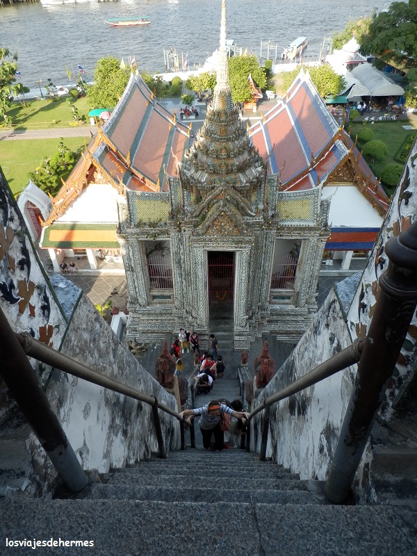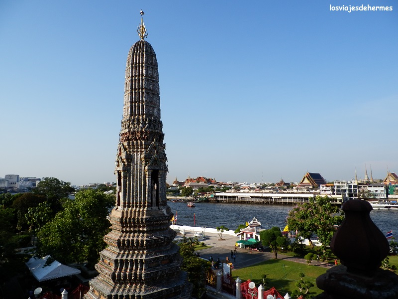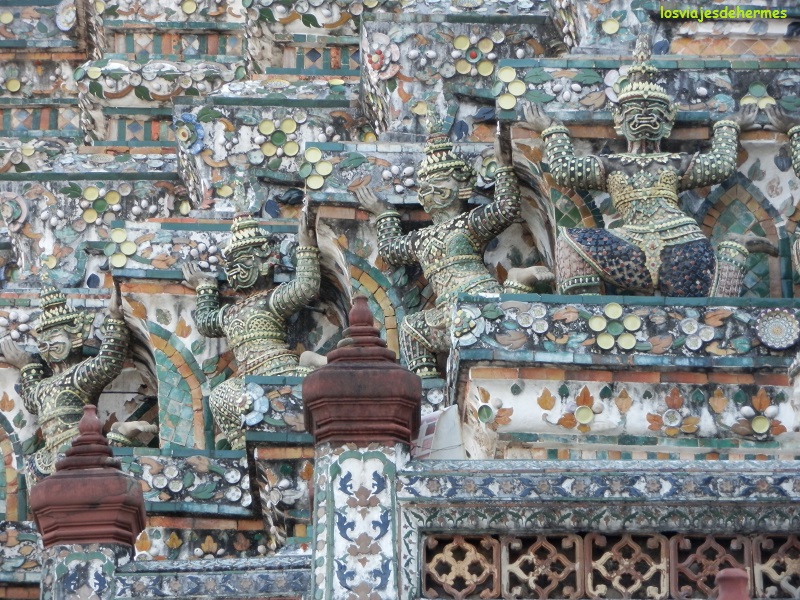 Como no podía ser de otra manera comimos en un restaurante chino de la zona por 150 THB=3,72 € los dos, volviendo después a la parada 5 del barco para ir hasta la 8 (Tha Tien) que está convenientemente ubicada enfrente del Wat Arun, obligándote a coger un pequeño ferry que cruza el río por la simbólica cantidad de 3 THB=0,07 €. Accedimos al Wat Arun (Templo del amanecer) por 50 THB=1,24 € cada uno, recorriéndolo con calma y observando los numerosos detalles y estatuas, algunas de ellas de divinidades hindúes, de este templo budista de estilo jemer. Es una visita imprescindible que mejoró aún más cuando coincidimos con un grupo de chicas vestidas con algún tipo de traje tradicional o de ceremonia. Después regresamos en barco a la parada 13 (la más cercana a Khao San Road) para descansar y ducharnos en la guesthouse, saliendo de nuevo de noche con la intención de acercarnos al Wat Arun iluminado, lo que le da un encanto especial.