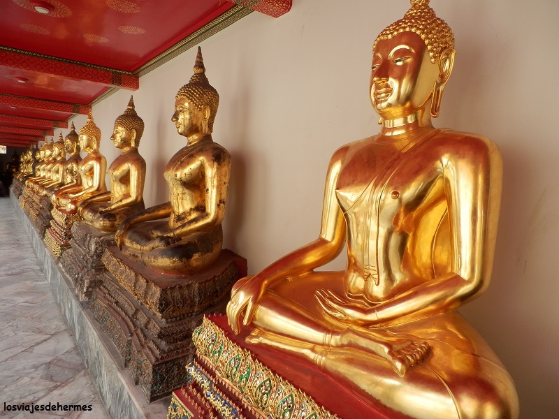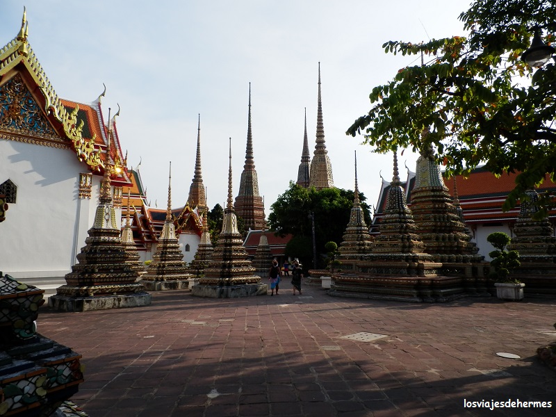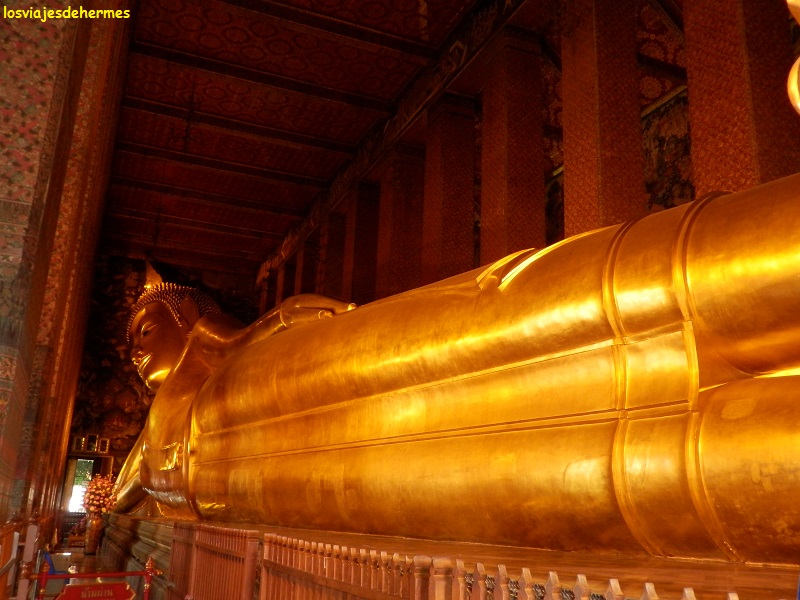 Para acabar las visitas del día nos quedaba otro plato fuerte, el gran Buda reclinado del Wat Pho (tiene 46 metros de largo por 15 de alto, ahí es nada), que se encuentra justo al sur del Gran Palacio y cuya entrada nos costó 100 THB=2,49 € a cada uno. Al igual que el anterior, este templo estaba impecable y rodeado de más templos pequeños y estupas (también llamadas “chedi” en muchos países del sudeste asiático), el monumento budista más característico presente en la mayoría de “wats”. Aquí también está la sede del centro de enseñanza de medicina tradicional tailandesa, que incluye masajes, por lo que es posible darse uno, al parecer es algo más caro, pero con garantías por lo que seguramente merezca la pena, nosotros lo dejaríamos para otro momento.