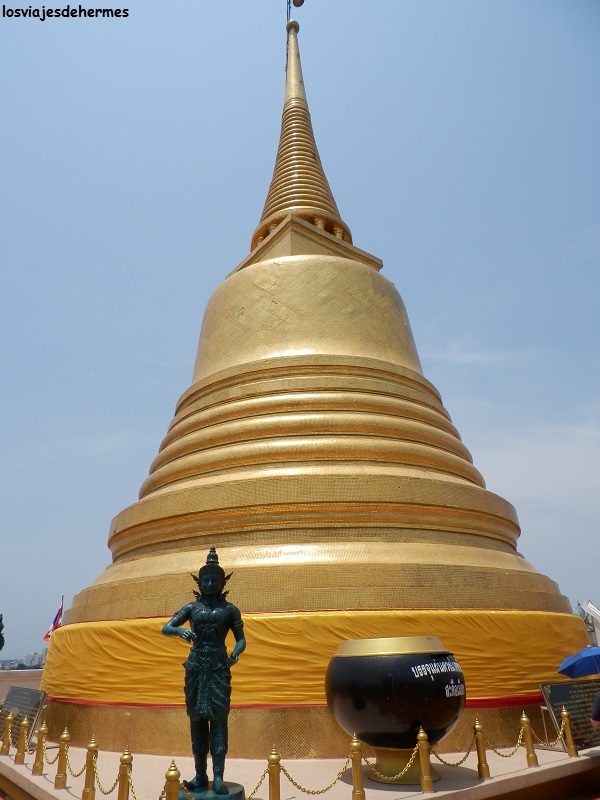 El Wat Inthra Wihan (entrada gratis) resultó ser un templo interesante dominado con una estatua de Buda (de pie) de 32 metros de alto, ni más ni menos. Paseamos por la zona atentos a los detalles, al menos en este templo había menos occidentales que en otros. Volvimos al tuk-tuk para que nos llevara al Monte Dorado (nos estuvo esperando y durante este trayecto hicimos la parada en la agencia), un lugar que no es de los más frecuentados pero que merece mucho la pena, pues al templo de la colina (el Wat saket, coronado con una estupa en su parte alta) se suman unas vistas de 360º de la capital tailandesa que no hay que perderse, acertando a ver tanto los rascacielos modernos como la parte antigua, eso sí sudaréis un poco subiendo los numerosos escalones hasta la estupa. La entrada consistía en 10 THB=0,25 € de carácter voluntario.