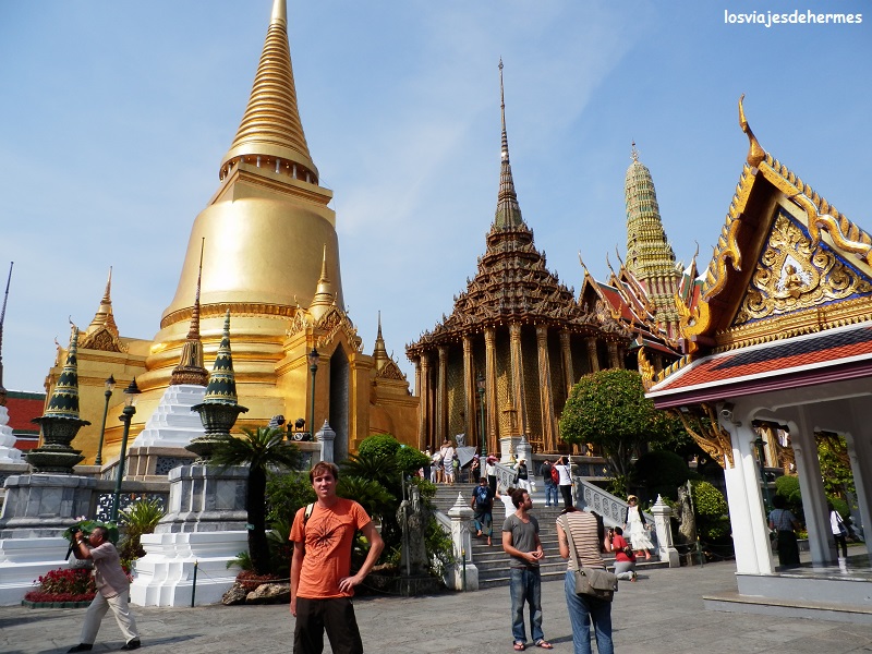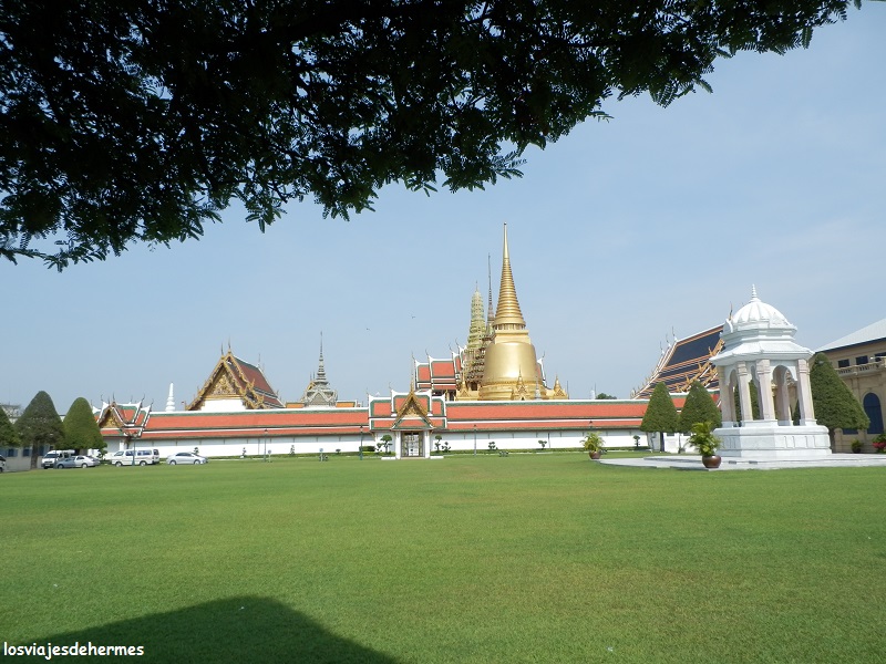 Este recinto fue la residencia real hasta mediados del siglo XX y cuenta como mayor atractivo con el templo Wat Phra Kaew, donde se refugia el más famoso y venerado Buda de Tailandia, el Esmeralda. La entrada cuesta 500 THB=12,43 € por persona (sin duda la más cara que se puede encontrar en este país), una vez dentro no hay que tener prisa ninguna pues se emplea un buen rato en verlo todo debido a la extensión del complejo, que cuenta con una infinidad de detalles donde pararse, además todo está muy cuidado como es lógico y lleno de gente. Primero visitamos el edificio del Chakri Maha y después todo el complejo del Buda Esmeralda (Wat Phra Kaew) con su templo principal (donde está el Buda) y toda una serie de pequeños templos y estupas a su alrededor.