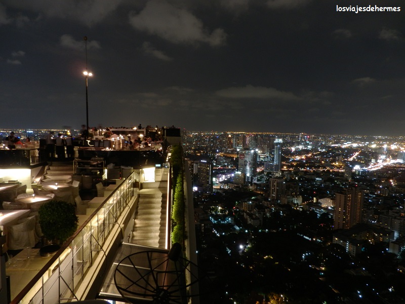 Regresamos al alojamiento, buscamos un sitio con internet para organizar los siguientes pasos del viaje y nos fuimos a uno de los bares de azotea que recomendaba la guía, el Moon bar at Vertigo. Para llegar hasta allí cogimos el metro desde Hua Lamphong hasta Lumphini (20 THB=0,50 € cada billete) y buscamos el edificio Thai Wah II en la calle Sathon Tai, cerca de la parada de metro. Para entrar me dieron un pantalón largo de vestir en el acceso (sino no entraba) y a disfrutar de las vistas de la ciudad en un ambiente moderno con música de fondo y gente bien vestida, pedimos dos refrescos (400 THB=9,94 €) y conocimos a una pareja de Bilbao que nos hablaron muy bien de la isla de Koh Tao, tanto que fue fundamental a la hora de cambiar de planes (en ese momento no sabíamos cuál iba a ser nuestra próxima parada), en definitiva pasamos un rato muy agradable con buena conversación y en un lugar privilegiado.