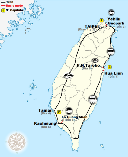 Itinerario: 8 días empezando en Taipei y bajando en tren bala a Tainan, de allí a Kaohsiung y a la costa este con parada en Hua Lien y excursión al parque nacional Taroko, para regresar a Taipei de nuevo y visitar el cercano Yehliu Geopark (ver mapa).