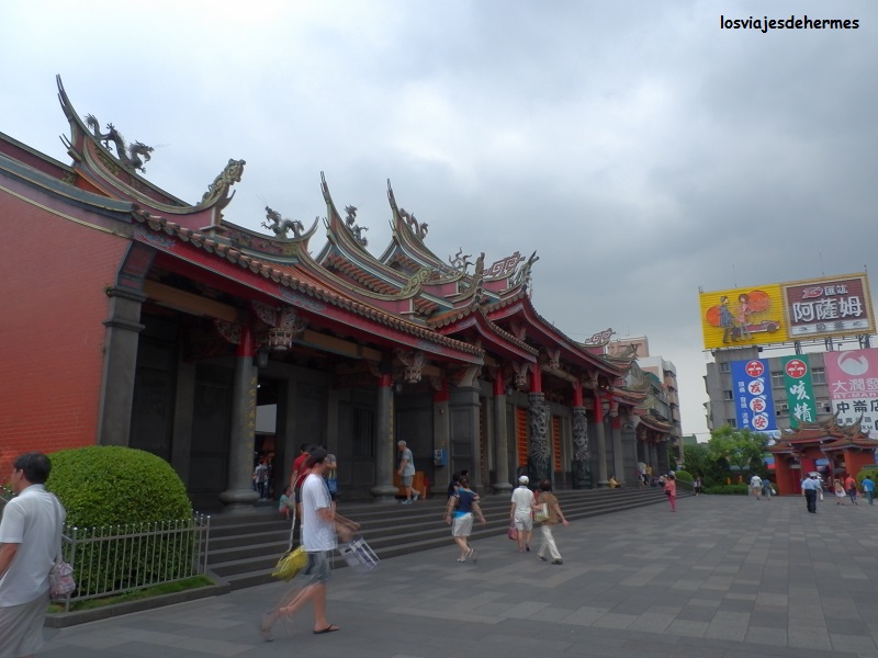 Acabamos de recorrer el memorial con la mayor atención posible y como teníamos tiempo y ganas fuimos a visitar el templo budista-taoísta de Longshan, en la parte antigua de la ciudad junto al río Danshui. Cogimos el metro en la parada del memorial siguiendo la línea 3 hasta Ximen y en una parada más estábamos en Longshan (línea 5, precio 20 TWD=0,57 € por barba). De nuevo el templo estaba a tope y el olor del incienso lo inundaba todo, si bien al ser budista y taoísta las figuras eran muy diferentes al confuciano, de hecho, también las ofrendas funcionaban de diferente manera. Permanecimos allí hasta aburrirnos y anduvimos hasta la zona comercial de Ximen, que no dejan de ser las típicas calles llenas de tiendas y gente que se pueden encontrar en casi cualquier ciudad, con la diferencia de que éramos los únicos occidentales y llamábamos bastante la atención, sintiéndolo así a juzgar por las miradas de los taiwaneses, hasta un artista local le hizo un retrato a Charo con un papel y unas tijeras para deleite de los viandantes. Sólo quedaba ya regresar al alojamiento con la línea 5 de metro para cenar y relajarse de tan intenso día.
