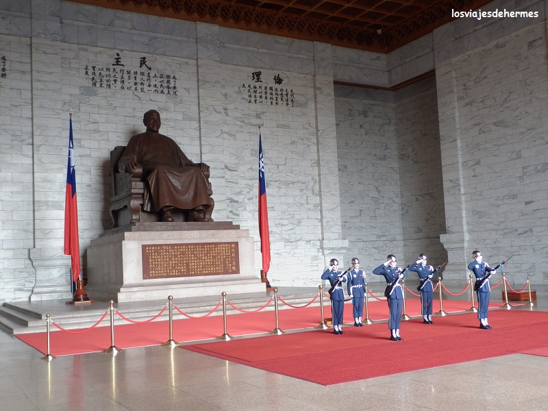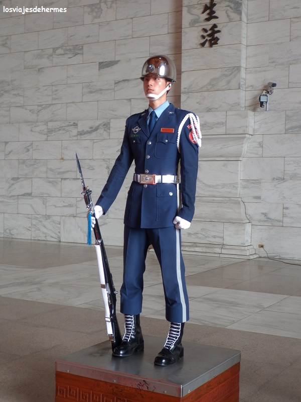 Dejamos a nuestra derecha el precioso Teatro Nacional y a la izquierda el Auditorio, ambas construcciones de un inequívoco estilo chino y nos acercamos al memorial en medio de la buena atmósfera que se respiraba en la zona, ascendiendo a la 4ª planta por la escalera exterior (también había ascensor), que es donde se encuentra la estatua de Chiang Kai-Shek sentado, que nos recordó mucho por no decir que era igual a la de Sun Yat-Sen del día anterior. Una vez más tuvimos suerte y justo se produjo el cambio de guardia en el que unos militares ejecutaron la maniobra con total solemnidad y muy despacio, como por lo visto es su paso para este tipo de actos, quedándose los que llegaron en unos pedestales vigilando y sin pestañear siquiera, parecían esculturas de cera o algo así…pero no lo eran, ¡qué profesionalidad!