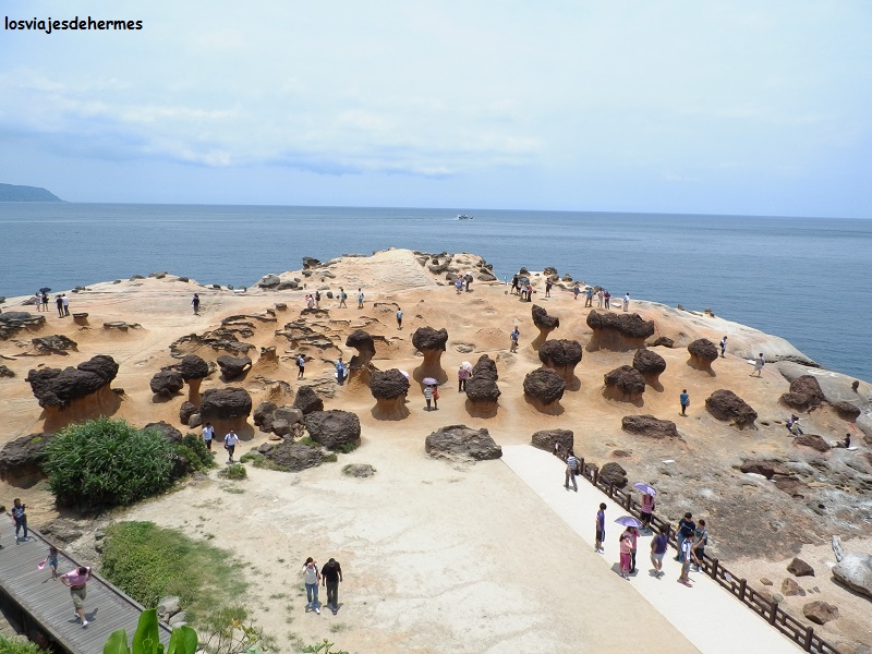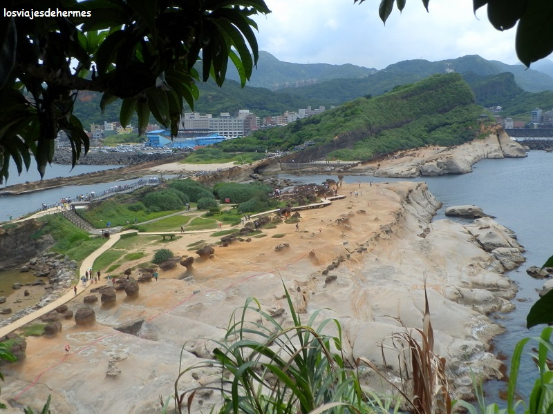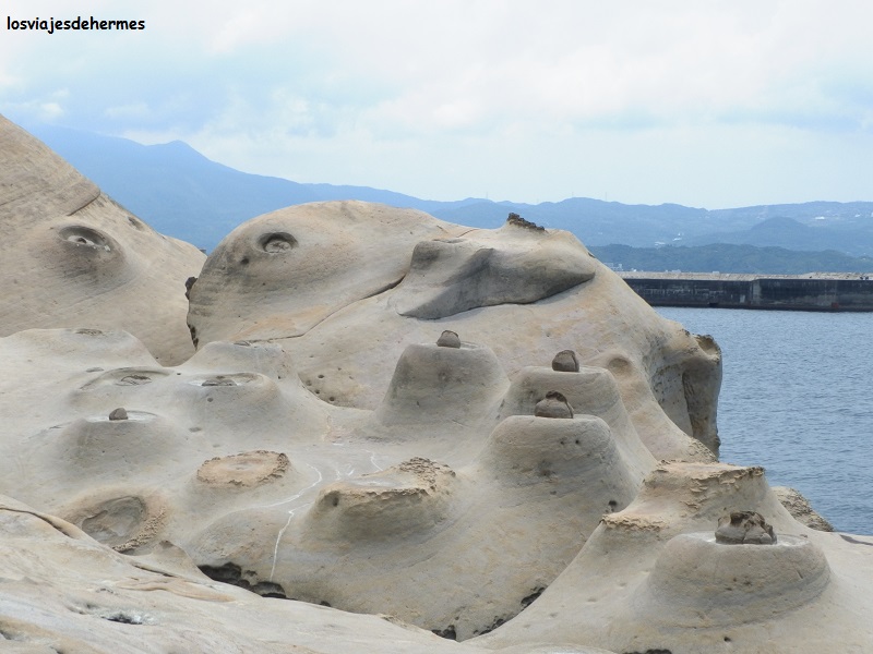 Esta curiosidad natural está en una lengua de tierra alargada de algo menos de 2 kms de longitud, donde tanto el agua como el viento han ido moldeando las rocas durante millones de años, permitiendo que la imaginación de los lugareños se dispare buscando todo tipo de similitudes, cosa habitual en cuevas y formaciones rocosas por otra parte. Y así es como pudimos disfrutar de las velas, los champiñones, el jengibre o el pájaro entre otros, y a decir verdad muchas de ellas sí que guardaban parecido con la realidad. Además, se pueden observar fósiles si se presta atención, como desde luego intentamos y conseguimos en un día muy caluroso, pero agradable gracias a la brisa marina. Paseamos y recorrimos el parque al completo, regresando en el mismo bus, que pasa cada 10-15 minutos a Keelung, donde comimos en una hamburguesería por 280 TWD=8,06 € los dos y dando un breve paseo por los alrededores del puerto de una ciudad que no es especialmente interesante.