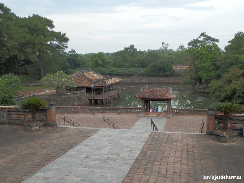 Las tumbas están situadas entre 5 y 15 kms al sur, pues hay varias al igual que hubo varios emperadores, llegando hasta la de Tu Duc (a unos 5 kms desde la estación) en pocos minutos y pagando la entrada de 80.000 VND=2,76 € cada uno. Este emperador tuvo el reinado más largo de la dinastía y diseñó él mismo el recinto, con diferentes pabellones y templos en su honor y en el de la emperatriz, así como un bonito lago con nenúfares en el que daba gusto pasear, en general todo está impecable y una hora y media, que es lo que tuvimos hasta que cerraban, es más que suficiente para verlo bien.