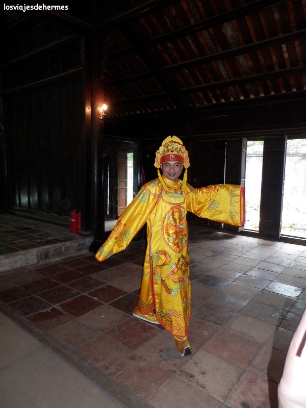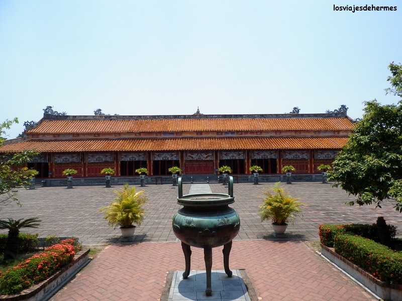 Accedimos al recinto imperial por la puerta de Ngo Mon (es la principal y está al sur) y cruzamos el puente hasta el palacio de Thai Hoa, con sus amplias salas en perfecto estado donde visionamos una película explicativa. Paseamos por la zona yendo después a la esquina inferior izquierda de la pequeña ciudadela imperial, donde están los pequeños templos de The Mieu y Hung Mieu, visitamos las casas Huu Vu y Ta Vu, lo que queda del Teatro Real o la residencia Dien Tho, todo tiene sus carteles y en la parte posterior de la entrada viene un mapa de situación. Del palacio hacia arriba todo estaba peor conservado y más descuidado de lo que esperábamos después de ver la primera parte, si bien es cierto que parte de este complejo fue destruido con anteriores conflictos. Salimos del recinto por la puerta norte llamada Hoa Binh acercándonos a unos lagos que hay (Tinh Tam y Tang Tau), que el emperador usaba para relajarse y que tienen unas pequeñas islas en su parte central.