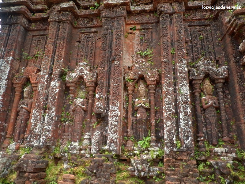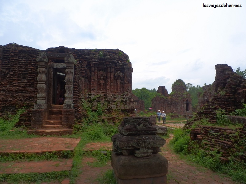 Una vez en el acceso principal pagamos la entrada (100.000 VND=3,45 € cada uno) y visitamos una interesante exposición de objetos de los Champa donde se cuenta toda su historia y evolución, continuando con la moto hasta el parking (a 1,5 kms) que nos costó 5.000 VND=0,17 €. Andamos un poco hasta llegar a la zona de las ruinas que están divididas en varios grupos (de la A a la G, también hay dos grupos más, H y K, pero son pequeños y poco importantes), siendo los grupos B y C los más vistosos y mejor conservados sin ninguna duda, el D (B,C y D están muy juntos) también está en pie, en el A, que fue destruido casi totalmente en la guerra, apenas se pueden ver los cimientos y montones de ladrillos, el E y F tampoco se conservan bien y el G está en fase de restauración. Con el mapa que hay en la parte posterior de la entrada y las señalizaciones entre las propias ruinas es fácil moverse por la zona y llegar a los diferentes grupos, además cuando estuvimos hacia bastante calor (salimos temprano) y había gente, pero no era agobiante ni mucho menos, de hecho, la mañana que pasamos descubriendo este lugar fue muy agradable.