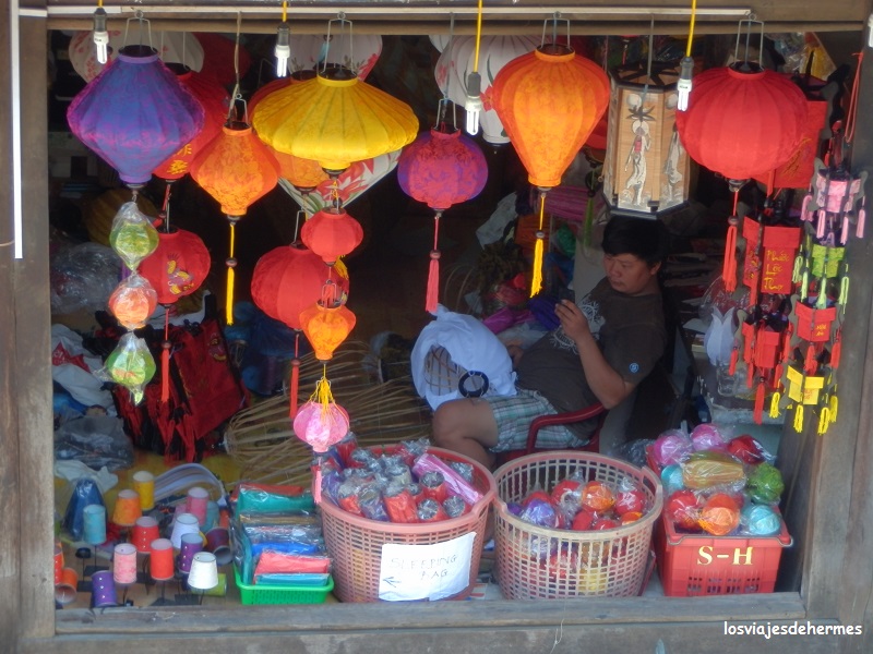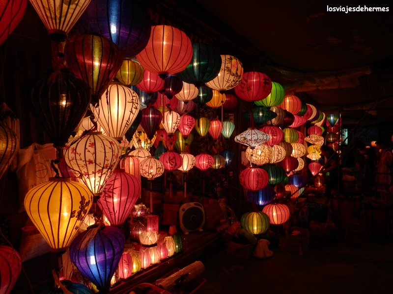 Al atardecer volvimos al centro para ver la ciudad de noche, con un ambiente todavía mejor que el de la mañana (ya no hacía tanto calor), mucha gente paseando y una agradable iluminación con farolillos tradicionales en algunas partes. Cruzamos el puente peatonal de An Hoi que cruza a la península del mismo nombre y está casi al lado del puente japonés, curioseando por el mercadillo nocturno de Nguyen Hoang (se pueden comprar farolillos y otros recuerdos), comiendo algo y charlando en inglés con unos turistas vietnamitas de Hanói que nos pidieron hacerse una foto con nosotros. Definitivamente Hoy An es parada obligatoria en cualquier circuito por Vietnam que se precie 😊.
