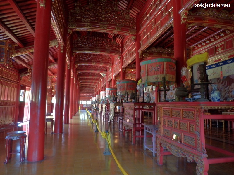 Accedimos al recinto imperial por la puerta de Ngo Mon (es la principal y está al sur) y cruzamos el puente hasta el palacio de Thai Hoa, con sus amplias salas en perfecto estado donde visionamos una película explicativa. Paseamos por la zona yendo después a la esquina inferior izquierda de la pequeña ciudadela imperial, donde están los pequeños templos de The Mieu y Hung Mieu, visitamos las casas Huu Vu y Ta Vu, lo que queda del Teatro Real o la residencia Dien Tho, todo tiene sus carteles y en la parte posterior de la entrada viene un mapa de situación. Del palacio hacia arriba todo estaba peor conservado y más descuidado de lo que esperábamos después de ver la primera parte, si bien es cierto que parte de este complejo fue destruido con anteriores conflictos. Salimos del recinto por la puerta norte llamada Hoa Binh acercándonos a unos lagos que hay (Tinh Tam y Tang Tau), que el emperador usaba para relajarse y que tienen unas pequeñas islas en su parte central.