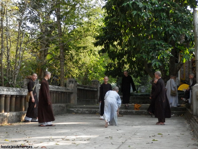 Con el problema ya comentado de que en el hotel nos dieron billetes de butaca dura cuando pagamos blanda, tuvimos que salir pues la furgoneta a Danang salía ya, sin tiempo de arreglar el “malentendido”. En la estación enseguida vimos que quedaban billetes de butaca blanda y los mejoramos por 20.000 VND=0,68 € cada uno y 10.000 VND=0,34 € de recargo. Hacer constar que el precio de la butaca blanda en la estación era de 71.000 VND=2,45 €, cuando en el hotel y cualquier agencia de Hoi An era mínimo de 126.000 VND=4,36 €, de ahí que siempre salga mejor comprar los billetes en la estación de ser posible pues los precios de las agencias no están tan ajustados como en Laos o Camboya. Durante los 30 kms que hay de Hoi An a Danang pasamos por el paraje de las montañas de mármol, una serie de promontorios con pagodas, santuarios y miradores que de tener tiempo suficiente puede merecer la pena visitar.