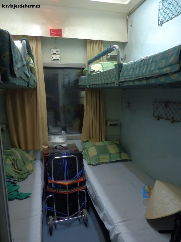Compramos comida a unos vendedores de la estación de Hué pero que no estaba muy allá (costó 60.000 VND=2,07 €), la verdad es que la que vendían a bordo del tren tenía mucho mejor aspecto, en cuanto a la habitación de dos literas estaba bastante bien con una pequeña mesita (y eso que el tren en general parecía viejo), el aire acondicionado fuerte como siempre y sobre todo para el de la litera de arriba, al que da directamente (se puede intentar con algún fular o prenda parecida taponar una parte para “regularlo”), en principio íbamos solos aunque luego se vinieron dos revisores a dormir en las camas libres. Por desgracia no veríamos el paisaje, pues estaba oscureciendo, pero sí se podía aprovechar para tomar notas para el blog o leer tranquilamente hasta que entrara sueño 😀 . Sin duda es una forma más cómoda de viajar que el “sleeping bus”, ya que incluso cada vagón tenía también un aseo básico, cosa inexistente en el autobús. Terminábamos así nuestra visita a las poblaciones con mayor historia e importancia cultural del país, aconsejando a los viajeros que hasta aquí lleguen a que no pierdan detalle y disfruten de estas dos ciudades.