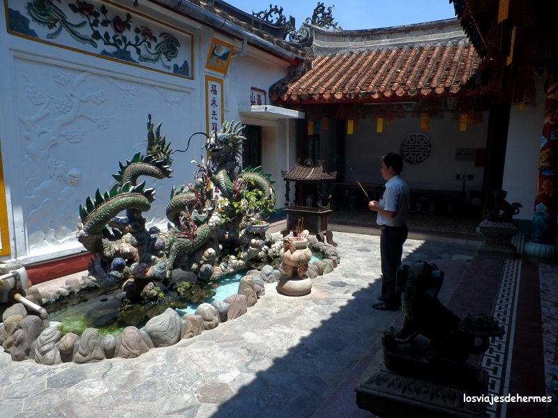 Ya instalados tardamos unos 15 minutos en llegar al centro, bajando por la calle Nguyen Truong hasta llegar a una caseta de información turística donde nos dieron un plano y pagamos una entrada combinada por 120.000 VND=4,16 € por persona que da derecho a 5 visitas de edificios diferentes (una pagoda, una capilla familiar, el museo de Cerámica Comercial, una sala de reuniones de una congregación china y una casa familiar) y hacerse así una buena idea de la arquitectura del lugar con diversos ejemplos. Comenzamos la visita en la pagoda de Phac Hat, una bonita estructura llena de adornos y detalles que está en la calle Phan Chau Trinh, yendo después un poco más al este a la esquina de esta calle con la de Nguyen Truong (por donde habíamos venido) para nuestra segunda parada incluida en la entrada, la capilla de la familia Tran, donde unas simpáticas chicas nos iban dando explicaciones en inglés de todo (que se seguían bien) y nos recordaban que el 90% de los numerosos objetos que había en la casa estaban en venta, fue interesante de todos modos.