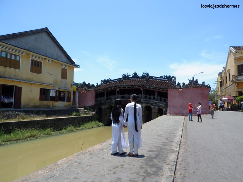 Después llegamos a la calle Nguyen Thai Hoc y entramos en la quinta y última visita incluida, la casa Tan Ky, en la que el tiempo parece que se detuvo hace 200 años porque todo se mantiene igual que cuando fue construida. De nuevo en el paseo fluvial (es la calle Bach Dang) llegamos al icono de la ciudad, el puente japonés cubierto que como su nombre indica fue construido por la colonia japonesa y cuenta con un pequeño templo en uno de sus extremos, además coincidimos con dos chicas jóvenes con traje tradicional vietnamita que estaban grabando algo y haciéndose fotos, mejorando así el momento presente.