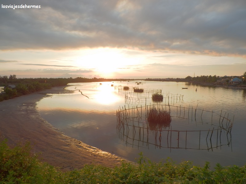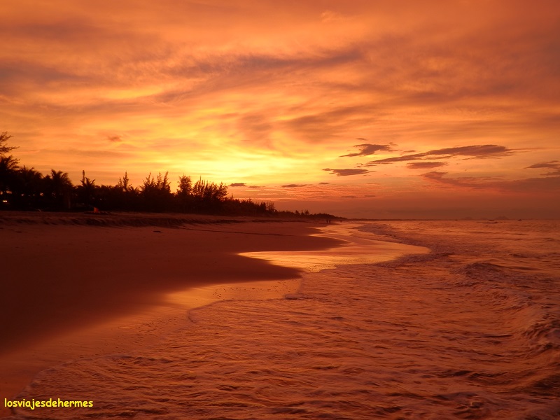Regresamos con calma a Hoi An (hasta nos llovió un poco) por las mismas carreteras, aprovechando al llegar para recoger la camisa que había encargado (quedó original) y pagar lo que faltaba. Comimos en uno de los restaurantes que había junto al hotel y que ya conocíamos por 136.000 VND=4,70 € los dos (pasta y bebidas), descansamos un rato y salimos de nuevo con dirección a la playa de Cua Dai hacia el este (apenas a 5 kms) pasando por zonas llenas de tiendas y restaurantes que estaban animadas. La playa era larguísima, sin gente y daba gusto pasear por allí, pudiendo disfrutar de otro precioso atardecer mientras al fondo podíamos ver la isla Cu Lao Cham. Nos hubiera gustado estar allí más tiempo, pero llegaba la hora de devolver la moto, así que echamos un último vistazo y nos dirigimos al restaurante donde la habíamos alquilado, junto a nuestro hotel, para que la hija de la dueña “recuperase” su vehículo y ya de paso cenar allí unas hamburguesas por 137.000 VND=4,74 € la cuenta total.