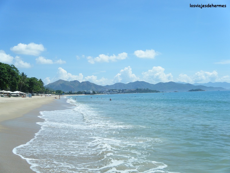 Nos acomodamos y pese a estar un poco cansados del viaje fuimos directamente a la playa, que es de arena, interminable y cuidada en general, alquilando unas tumbonas con sombrilla por 80.000 VND=2,76 € por día pues el tiempo era muy soleado y caluroso. Pasamos allí la mañana entre baños (el agua estaba caliente), cabezadas en las tumbonas y ratos de tomar algo de sol hasta que apretó el hambre. En las calles adyacentes encontramos un restaurante “Pho 24”, pidiendo pollo uno y arroz vermicelli otro con limonadas por 121.000 VND=4,19 €, muy bueno todo. La ciudad de Nha Trang tiene ya casi 400.000 habitantes y gracias a sus playas e islas cercanas (que son ideales para bucear) es un atractivo destino turístico de Vietnam que por lo visto (lo pudimos comprobar en el paseo vespertino) atrae mucho a los rusos, pues se ven multitud de carteles y cartas de restaurantes en su idioma.