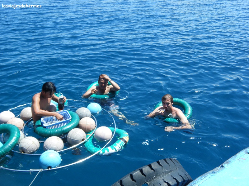 Después nos dirigimos a la isla más lejana, la de Hon Mun, por lo que pudimos disfrutar navegando del espléndido día que hacía, llegando a la isla en la que había que pagar 10.000 VND=0,34 € al ser una reserva marina y buceando con el equipo prestado entre arrecifes y multitud de peces de todos los colores. Con esto ya la cosa mejoraba bastante y es que el agua estaba completamente transparente, aprovechando al máximo el tiempo que estuvimos (suficiente a mi juicio para llevarse una buena idea del lugar). Nuestra tercera isla fue Hon Mot, fondeando justo al lado de unos muelles flotantes con casas pudiendo apreciar este modo de vida sobre el mar tan característico de Vietnam y también presente en otros países de la zona. Allí comimos a bordo y empezó la hora feliz de la diversión, despejando el centro de la cubierta del barco para actuaciones, empezaron los animadores cantando, bailando algo y como a los chinos les costaba arrancar (son más tímidos) nos tocó cantar y bailar la macarena. Parece que les gustó y después de esto los chinos se vinieron un poco arriba y empezaron con su repertorio, todo acompañado de un cóctel muy suave y baños alrededor del barco para quien quisiera (no tardé en unirme y saltar desde cubierta), fue un rato divertido desde luego.