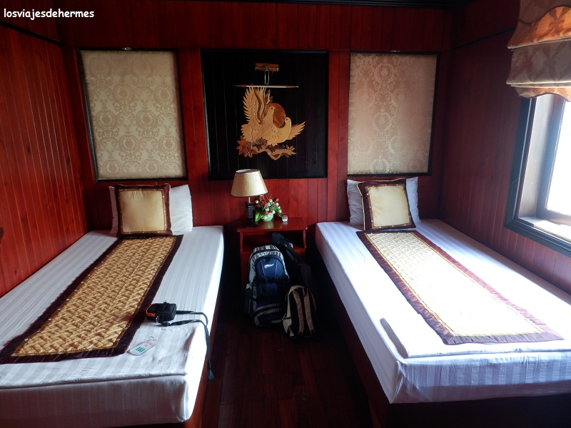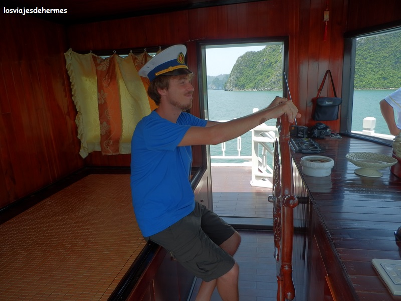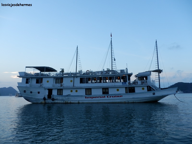 Nos despedimos de nuestro alojamiento y fuimos a la oficina de Sinh Café Travel (justo en la calle paralela), donde amablemente nos permitieron dejar en una habitación el equipaje, llevando sólo uno de los macutos para la excursión de 3 días y 2 noches, saliendo en un minibus a las 8 y cuarto de la mañana. Tardamos unas tres horas en llegar a la población de Halong Bay (hay unos 150 kms desde Hanói), con una parada entre medias y con una conducción decente en general (afortunadamente), esperando un buen rato en la terminal (a tope de gente) hasta que nuestro guía, llamado Peter, nos organizó formando un grupo internacional con mayoría inglesa, algún francés, una pareja rusa, un suizo y nosotros. Finalmente fuimos embarcando con un barco auxiliar al “Imperial Cruise”, en el que pasaríamos todo el día y la primera noche del tour, ya con un aspecto muy bueno desde fuera que enseguida mejoró según íbamos visitando el salón-comedor, baños y nuestras habitaciones, realmente tengo que decir que estaba todo impecable, muy limpio, con aire acondicionado y ventiladores en las habitaciones y hasta wifi, igualmente durante el trayecto a bordo vimos algún barco que parecía demasiado viejo y otros de más lujo, sin duda es importante acertar con esta elección de la que puede depender el éxito de la excursión.