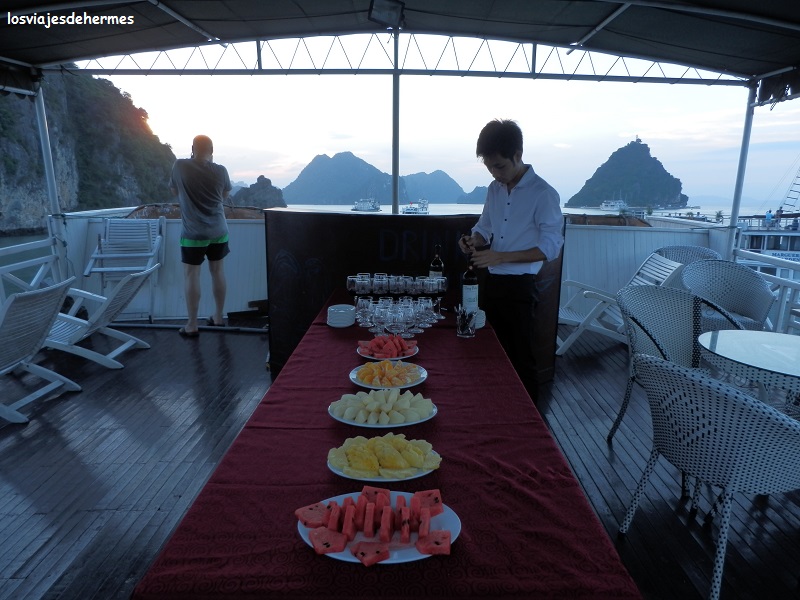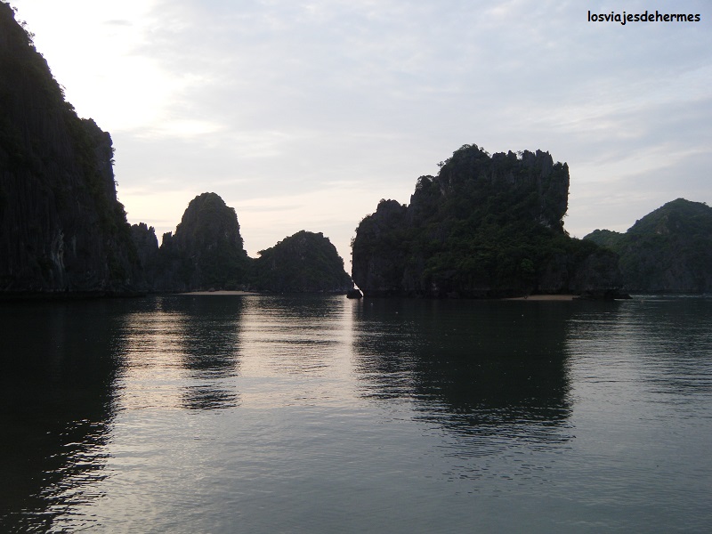 Empezaba a caer el sol y como no podía ser de otra manera tocaba disfrutar del atardecer, seguido de la cena también tipo buffet. De noche, entre algún que otro mosquito, nos relajamos en las hamacas en medio de una calma total, sin viento ninguno, pocas luces que dejaban ver las estrellas y una animada conversación, sin duda un gran momento de relajación que había que guardar, encima se me ocurrió proponer a la gente quedar al amanecer del día siguiente para nadar un rato (eso era a las 5 y media de la mañana) y para mi sorpresa Marcial dijo que se apuntaba. Así que seríamos dos valientes con la intención de ir a la playa de enfrente, que según descubrí en el mapa después corresponde ya a la isla de Cat Ba, la más grande de la Bahía de Halong y una de las variantes de excursiones que más veréis en las agencias, que suele incluir pasar un día con rutas en bici por esta isla, lo que no suena nada mal, pero en cualquier caso nosotros acabamos encantados con el tour contratado y sinceramente no lo hubiera cambiado.