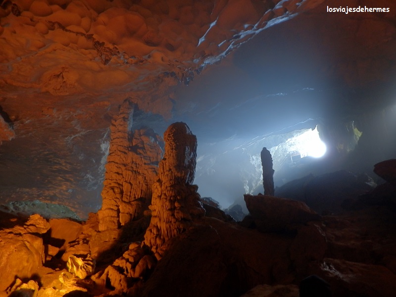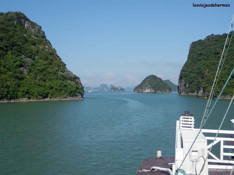 Hacer constar que es posible hacer recorridos de un día, dos días y una noche o de tres días y dos noches, recomendando este último si se dispone de tiempo suficiente ya que el lugar lo merece. La bahía al completo fue declarada Patrimonio de la Humanidad en 1994 y está formada por cientos y cientos de islas e islotes de origen kárstico que surgen del mar creando un paisaje de ensueño, también fue declarada una de las 7 maravillas naturales del mundo y en cuanto zarpamos y navegamos un rato pude empezar a hacerme una idea de lo que nos esperaba. Encima el día era soleado y caluroso y el mar, gracias al resguardo de tantas islas, estaba muy bien. Comimos a bordo antes de entrar de lleno en la bahía y sólo puedo decir que fue excelente, añadiendo más puntos positivos al paquete contratado, toda la comida estaba incluida pero no las bebidas, siendo precios de referencia la botella de agua a 20.000 VND=0,68 € y la cerveza a 40.000 VND=1,37 €. A partir de este momento tocaba tener las cámaras a mano para ir tomando fotos, pero sobre todo abrir bien los ojos para no perderse nada, el paisaje es espectacular y siempre los primeros momentos son los más impresionantes, hasta que llegamos a la primera visita del día.