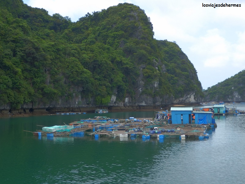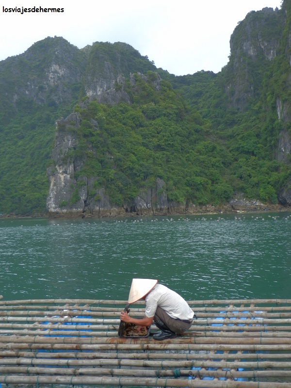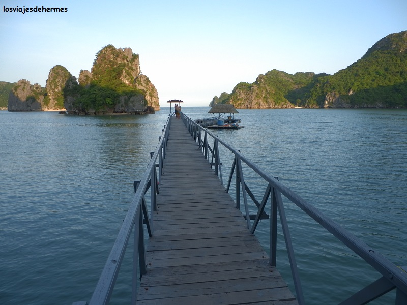 Cumplimos nuestra promesa y a las 5 y media, justo cuando comenzaba a amanecer, estábamos ya en el agua cruzando el canal hasta la cercana isla de Cat Ba, con el mar como un plato, aunque esquivando alguna medusa (yo llevaba gafas), pues la temperatura del agua es elevada, lo que favorece su presencia. Con tiempo suficiente volvimos, desayunamos todos juntos y a despedirse de algunos, pues cada cual regresaba a su embarcación. Navegamos un buen rato entre canales estrechos, más islotes y observando casas flotantes de pescadores en muchos rincones hasta que divisamos el “Imperial Cruise” de nuevo, al que regresamos para ir ya a la ciudad de Halong Bay.