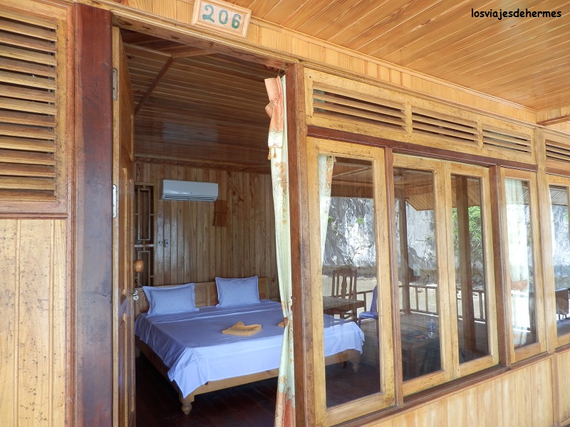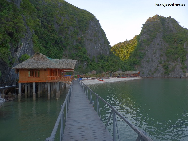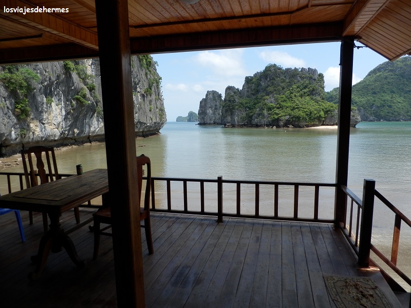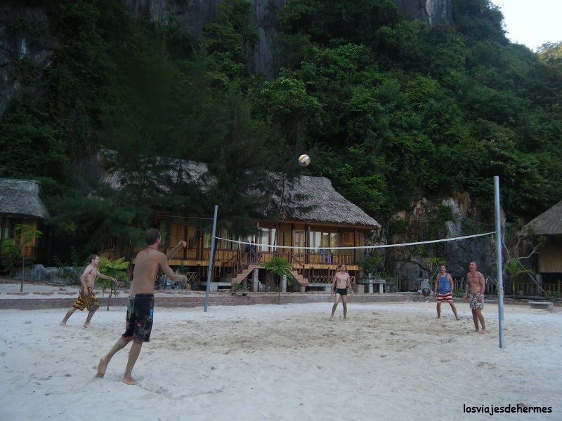 Poco a poco regresamos al barco para continuar con la excursión navegando hasta el Nam Cat Island Resort, un grupo de bungalows encajados entre una pared de roca cubierta de vegetación y una playa de arena que parece salido de un póster, es una pasada, personalmente el lugar me encantó. Comimos allí tipo buffet (no tan bueno como en el barco, pero suficiente), estando la comida incluida pero no las bebidas al igual que en el resto de la excursión, los precios de las bebidas eran igual que en el barco, es decir el agua a 20.000 VND=0,68 €, la cerveza a 40.000 VND=1,37 € y los cócteles a 80.000 VND=2,76 €. Al acabar de comer hicimos el check-in en los bungalows que estaban limpios, los baños con toallas, ventiladores y unas enormes ventanas que daban al mar, sin queja ninguna vamos. Pasamos la tarde en la playa tranquilamente y casi siempre en compañía de Marcial y unos argentinos que llegaron al complejo en otro barco (Hugo y Celeste) y estaban de viaje de novios, nadamos al islote de enfrente e incluso se organizó en un momento un partido de voley playa internacional en el campo que había. También existía la posibilidad de cogerse un kayak para darse una vuelta.
