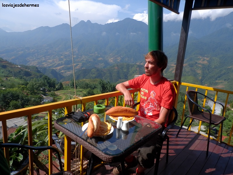 En esta zona se encuentran la mayoría de los restaurantes, agencias para excursiones y tiendas, siendo fácil ver grupos de mujeres de la etnia hmong por las calles (tienen rasgos asiáticos, pero son de tez más oscura), con sus vestimentas típicas ofreciendo trekkings y excursiones a sus aldeas, si bien mantuvimos nuestra idea original de ir a nuestro aire con una moto. Las costumbres y formas de vida de este grupo de gente son un gran reclamo turístico para la región y ellos parecen haberse amoldado bien, por lo que quizás sea difícil vivir una experiencia totalmente auténtica al respecto. Comenzó a llover y tuvimos que resguardarnos, regresando finalmente al hotel a comer en la terraza con vistas por 80.000 VND=2,76 € los dos unos platos de pasta. Por la tarde no hicimos nada interesante, siesta y descanso, gestionar una moto para el día siguiente en el propio alojamiento, leer, tomar notas para el blog y charla con otros viajeros, saliendo a cenar unos pinchos de carne con unas mazorcas de maíz en un puesto callejero por otros 80.000 VND=2,76 € los dos.