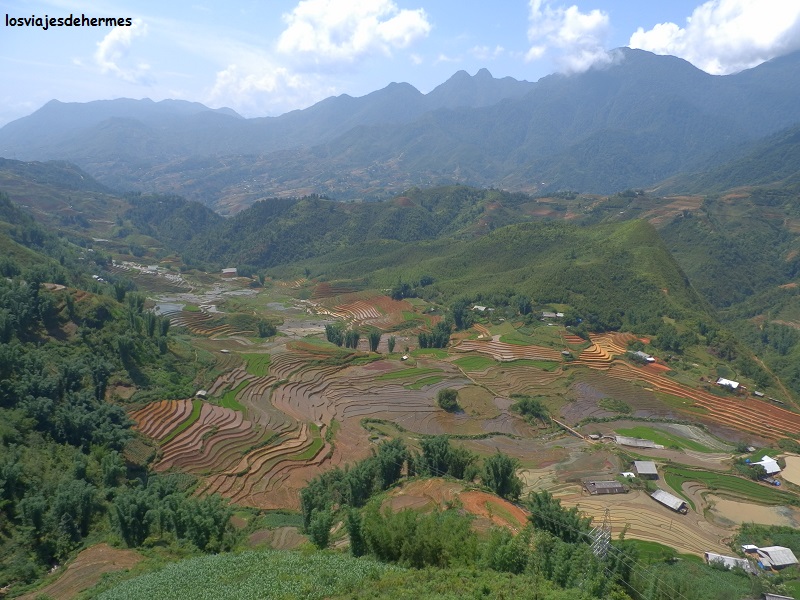 Desayunamos bien a gusto en la terraza del hotel con unas vistas espectaculares y con la enorme suerte de que el día estaba despejado y soleado, que en esta región no es lo habitual. Ya en la recepción recogimos la moto (100.000 VND=3,45 € el día), junto a los cascos y un mapa fotocopiado, repostamos e iniciamos camino siguiendo la calle del hotel hacia abajo (llega a estar bastante inclinada), para llegar a la villa hmong de Cat Cat en apenas 2 kilómetros. A mitad de camino hay un mirador con vistas al valle, lleno de arrozales en terrazas escalonadas, y a las montañas que lo rodean, una preciosidad.
