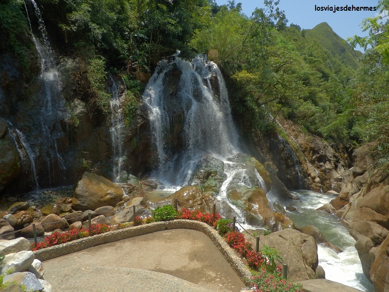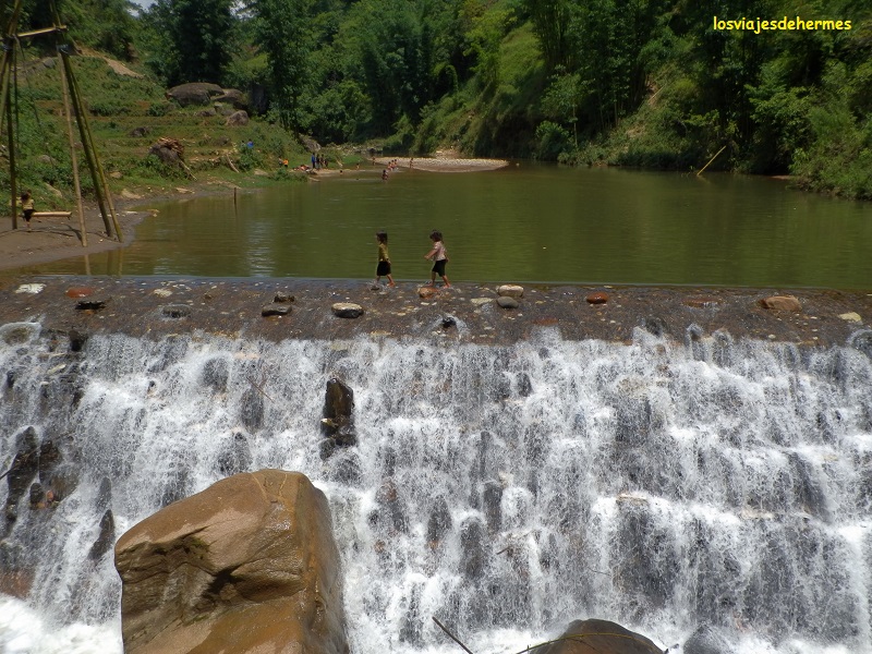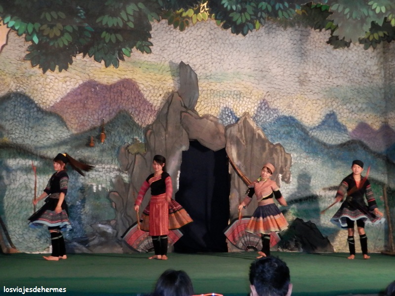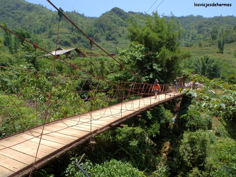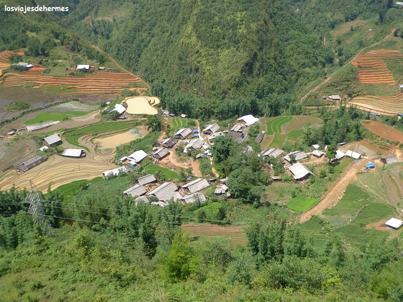 Ya en la aldea de Cat Cat pagamos 10.000 VND=0,34 € de parking y 40.000 VND=1,37 € de entrada por persona, visitando el pueblo a paso tranquilo, observando sus casas, cruzándonos con los niños que iban corriendo y jugando y los adultos con sus trabajos (muchos habían transformado sus casas en tiendas de recuerdos y artesanía hmong). Pasamos por un puente junto a una bonita cascada llegando a un pequeño teatro donde representaban bailes típicos, sin duda es interesante y una buena manera de entrar en contacto con las costumbres de esta gente, aunque toda la aldea en conjunto esté muy orientada al turismo. El recorrido que hicimos, siguiendo un folleto que nos dieron al entrar, sería de unos 2 kms tardando un buen rato al ir parando o curioseando por todos lados, acabando en un puente elevado que llevaba de nuevo al parking. Con la moto fuimos subiendo cuesta arriba hasta Sapa de nuevo, parando para hacer algunas fotos y es que el día que hacía bien lo merecía.