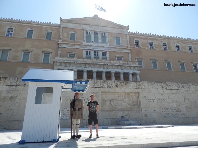 De allí pusimos rumbo a Syntagma pasando junto a la fachada del palacio Zappeio y atravesando los interesantes jardines nacionales, un verdadero oasis dentro de la ciudad con multitud de rincones donde parar a ver a la gente pasar, descansar o escuchar el canto de los pájaros. La Plaza Syntagma es el triste símbolo actual de la crisis griega por la cantidad de veces que ha salido últimamente en televisión entre manifestaciones y disturbios, si bien la encontramos -al igual que la ciudad en general- más limpia y aseada de lo esperado, no tuvimos problema alguno y llegamos justo a tiempo de curiosear entre la multitud en el cambio de guardia del Parlamento (cada hora en punto), ganándose los dos soldados el respeto de todos por cómo aguantaban impasibles con lo que apretaba el sol así como el continuo carrusel de gente haciéndose fotos con ellos.