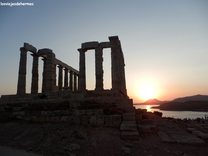 El bus deja en el mismo acceso al espectacular Templo de Poseidón (o Neptuno, 4 € la entrada) que domina el cabo entre amplias panorámicas del mar Egeo, islas cercanas y la propia costa, es un lugar ideal para amantes de las puestas de sol como nosotros, así lo recordaba yo de mi primera visita muchos años atrás y no nos decepcionó, el marco para la foto no puede ser mejor, buscando la mayoría de la gente la perspectiva del sol ocultándose por las imponentes columnas del templo del dios del mar, un lugar especial sin duda. Regresamos en el último bus por el mismo precio -si bien tardó menos- bajando en la parada que hizo en la plaza Syntagma, desde la que anduvimos al hotel, notando el peso en la mochila de no haber dormido mucho, pero sabedores de que habíamos exprimido todo el jugo posible a la jornada.