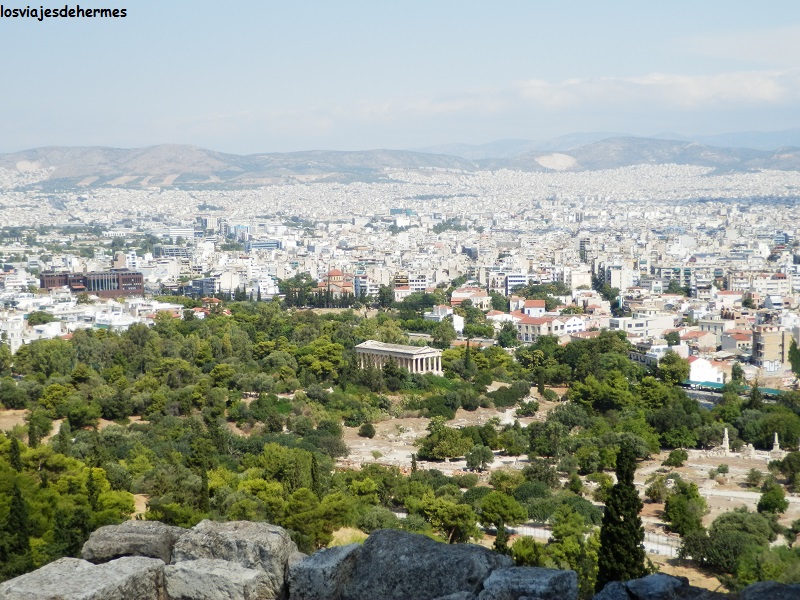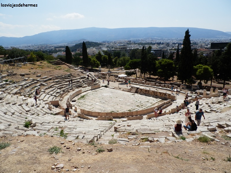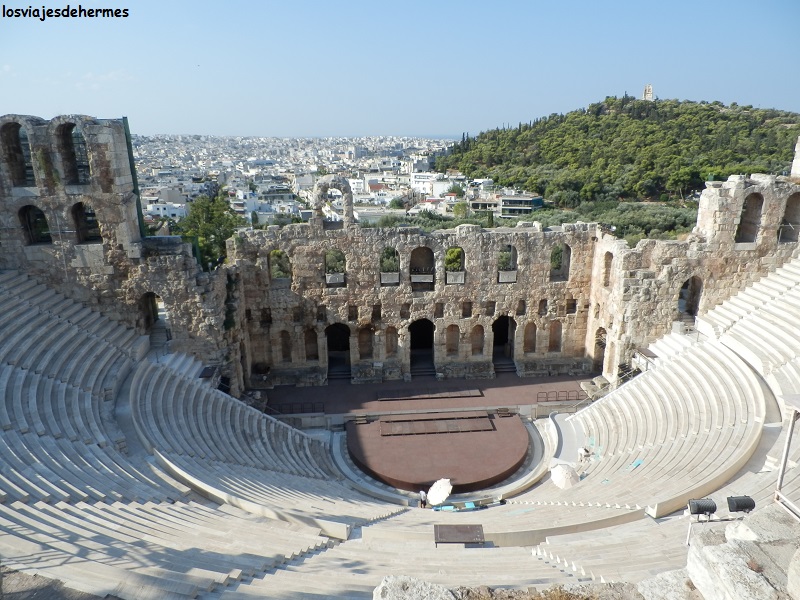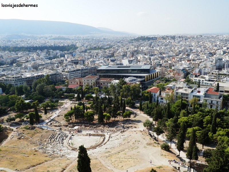 Las vistas desde cualquier punto de la Acrópolis de la capital griega -donde residen casi 4 millones de personas de los algo menos de 11 que tiene el país- son espléndidas, advirtiéndose entre el mar de edificios modernos otras construcciones clásicas y sucesivas colinas. Bajando por la ladera sur pudimos ver el restaurado Odeón de Herodes Ático y el Teatro de Dionisos (incluido en el tique), con un aforo considerable para la época, saliendo por la zona peatonal del gran paseo (calle Dionysiou Areopagitou) y bordeando la propia Acrópolis, la colina del Areópago y el recinto del Ágora Antigua.