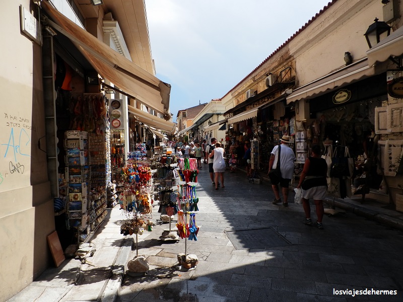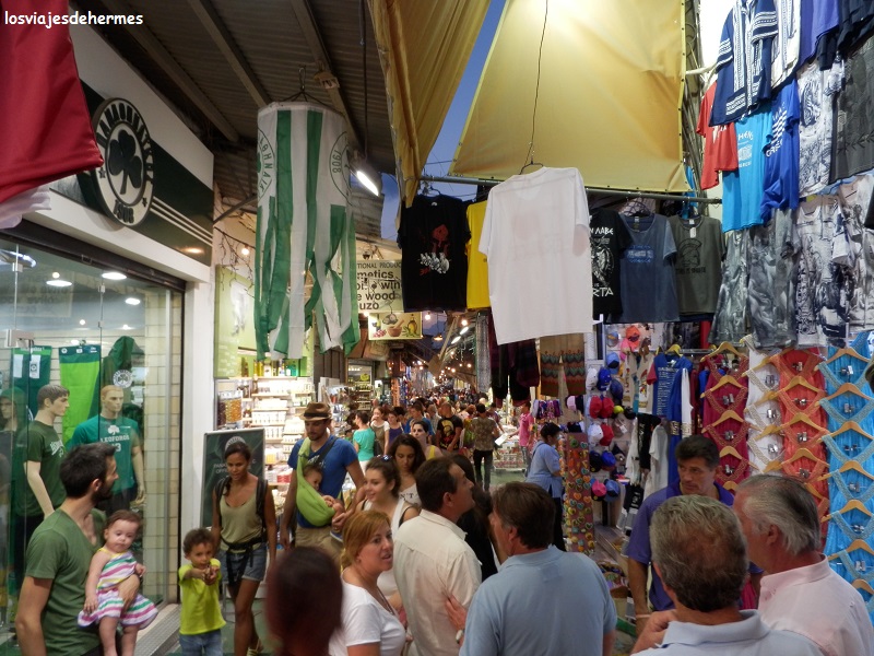 De allí salimos al bullicioso barrio comercial de Monastiraki, con gente, mercadillos y tiendas por doquier, echando un breve vistazo desde el exterior a la Biblioteca de Adriano y accediendo (otro más de la entrada de 12 €) al Ágora Romana por la puerta de Atenea Archegetis, recinto éste de extensión mucho menor que la Antigua y con la propia puerta y la Torre de los Vientos como edificaciones notables. Tocaba llenar el buche y callejeando por el barrio encontramos uno de los restaurantes que llevábamos anotados, el “Platanos” (C/Diogenous, 4), donde la mousaka y la ensalada griega, bien acompañadas por la cerveza local Mythos hicieron el resto, todo estupendo (el precio: 15 € por barba).