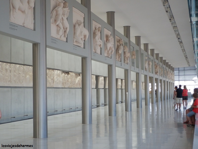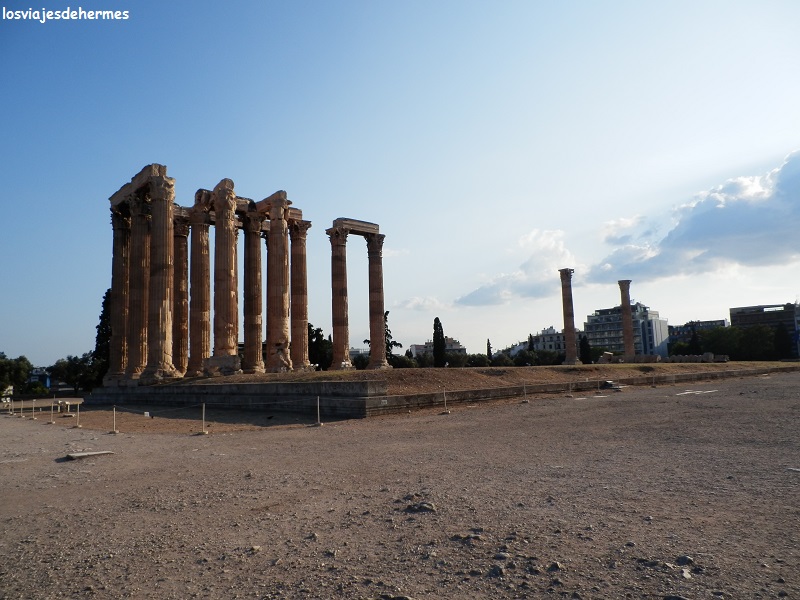 Como sobremesa elegimos un lento paseo por el barrio de Plaka, previo vistazo a la Catedral ortodoxa, igualmente comercial y saturado de tiendas de recuerdos, ropa, joyas, en fin, de todo, su máximo esplendor se muestra en la calle Adrianou. Y sin darnos cuenta aparecimos de nuevo en el acceso de la Acrópolis, justo enfrente de nuestra próxima parada, el Museo de la Acrópolis (5 € de entrada), un excelente edificio climatizado donde reposan las reliquias de la misma, como las Cariátides de verdad (las del Erecteión son copias) o la impresionante galería del Partenón que reproduce el friso mostrando las partes existentes (otras muchas están en Londres). Un par de horas serían las que allí pasamos, retomando y acabando la visita a los monumentos clásicos en el gigantesco Templo de Zeus (incluido en el tique) con columnas que llegan a los 17 metros de altura, un lugar imponente desde el que vimos al sol ocultarse tras la Acrópolis…hasta que llegó la hora del cierre (20 horas).