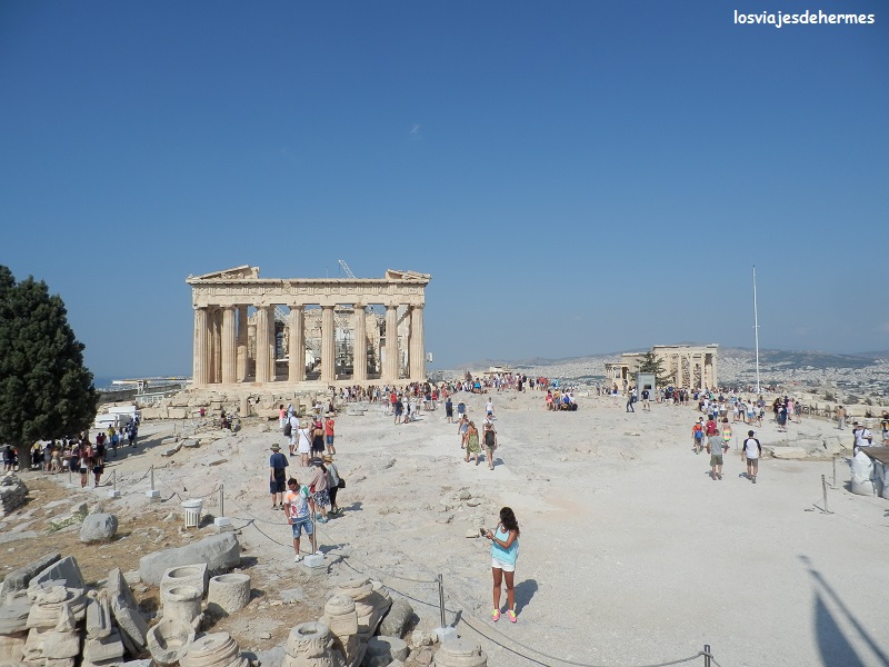 Con las pilas recargadas nos dirigimos directamente al plato fuerte del día, la histórica Acrópolis, a la que accedimos por la inusual y pequeña puerta norte donde nos hicimos con el ticket de 12 € que da derecho a visitar la propia Acrópolis, el teatro de Dionisos, el Ágora Antigua, el Romano, el Templo de Zeus y el yacimiento de Keramikos. Fue un acierto llegar aquí temprano tanto porque el sol no está en todo su esplendor como por las inevitables hordas de turistas que aún no están en su máximo.