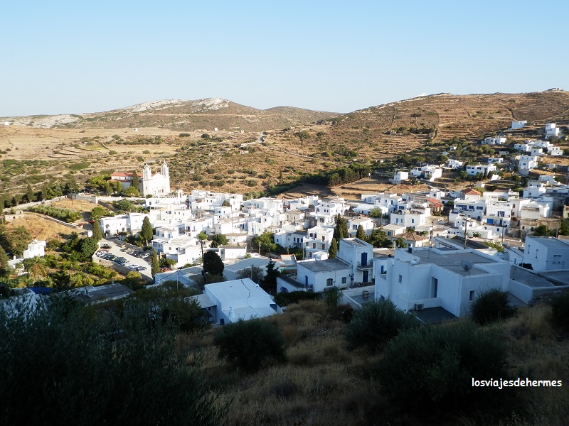 Para llegar al primero hay que regresar a Naousa y coger la carretera de Ambelas hacia el sur hasta que se llega al desvío a la derecha donde ya están indicados, empezando a subir cuestas y pasar curvas, lo que hace el camino entretenido y con buenas vistas y recorriendo unos 11 kms hasta Kostos. Una vez allí nos vimos casi solos en un pintoresco pueblecito con sus iglesias y vistas hacia la costa, continuando hasta Lefkes (a 4 kms), antigua capital de la isla y hoy atractiva villa con sus casas escalonadas, la catedral de Agias Trias como construcción principal y un buen ambiente general. Sin duda una perfecta incursión a los pueblos de interior, con sus similitudes y también diferencias con los costeros.