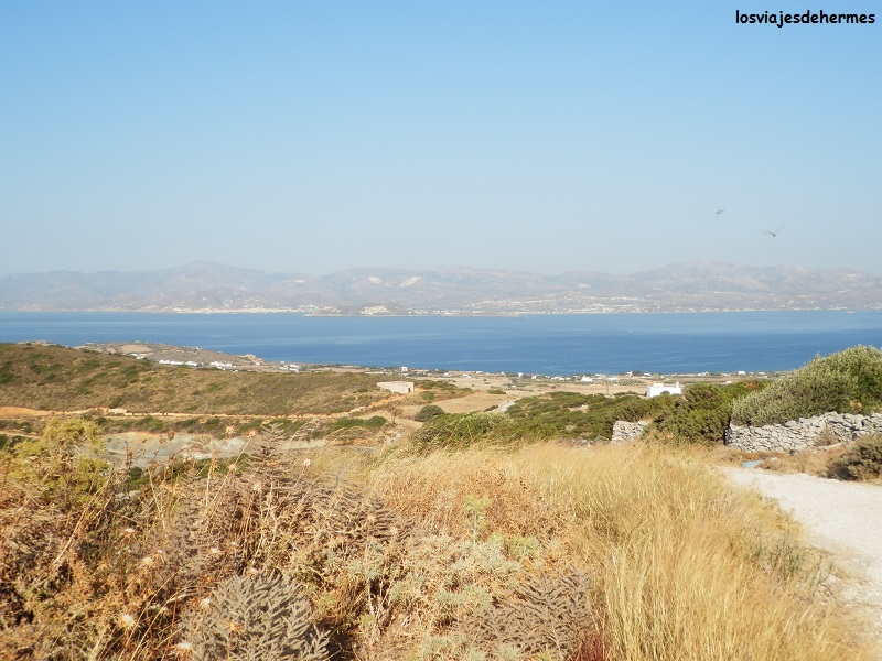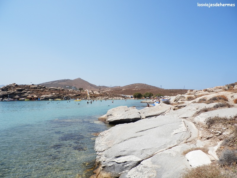 Aprovechamos para comer en uno de ellos pasta y kleftiko, un guiso a base de carne de cordero tan bueno como pesado (sobre todo para el calor que hacía), todo a 22 € los dos. Nos subimos a “Tigretón”, que se estaba portando muy bien la verdad, y dejando atrás el blanco y el azul de Naousa nos dirigimos otros 5 kms al este hasta la playa de Santa María, donde buscando un poco dimos con unas piedras cómodas para tumbarnos y lanzarnos al agua tranquilamente, pues lo que es la playa de arena estaba a tope. Otro lugar ideal para bucear y darse un buen baño con la cercana isla de Naxos de fondo, dando así la sesión playera del día por terminada y poniendo rumbo a las villas del interior de la isla, concretamente Kostos y Lefkes.