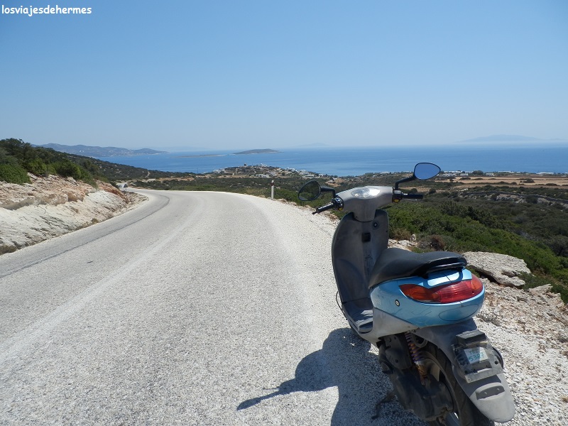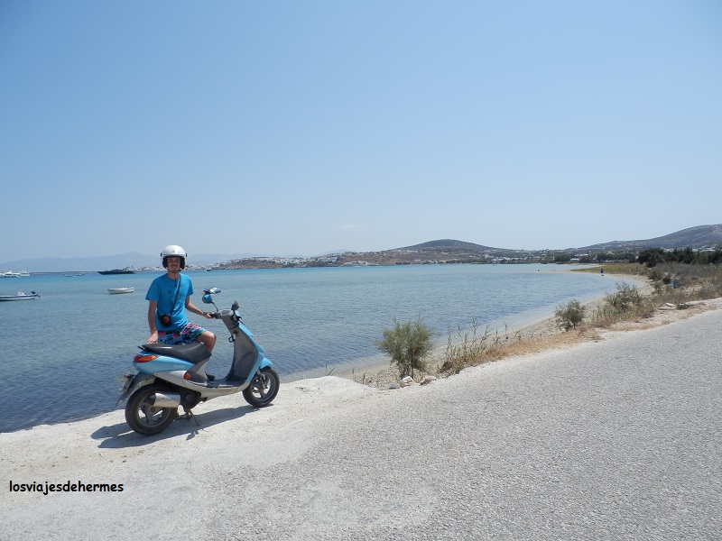 Previa visita rápida a la preciosa iglesia Panagia Ekatondapyliani (gratis) nos dirigimos a Livadia para buscar una moto con la que explorar la isla, decidiéndonos por la que nos ofrecían en “Paros Bikes” a 30 € el día (posibilidad de seguro completo por 5 € más), un poco vieja pero no quedaba más remedio. La bautizamos como “Tigretón” y como era de esperar nos la dieron con el combustible justo para llegar a la gasolinera, repostando y saliendo de la ciudad por la carretera a Naousa hasta llegar al desvío a las playas de Kolimbythres y Monastiri junto a la bonita bahía de Plastira.