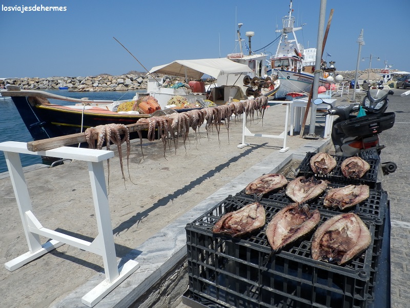 Decidimos ir a la de Monastiri (unos 12 kms desde Parikia), una impoluta playa de aguas cristalinas al igual que las del resto de la bahía, como ya habíamos advertido mientras seguíamos la línea de costa para llegar hasta aquí, disfrutando del sol, el agua y el buceo, así como de la tranquilidad de la zona. Un buen primer plato sin duda, pero los siguientes no se quedarían atrás, pues nuestro siguiente descubrimiento fue el encantador pueblo de pescadores de Naousa, a sólo 8 kms desde la playa, lugar que atrae ya a bastantes turistas pero que mantiene su esencia intacta, caminando entre sus callejones del centro, su pequeño paseo frente al puerto lleno de restaurantes y pulpos colgados secándose o su particular fortaleza rodeada de mar desde la que se ve el pueblo al completo.