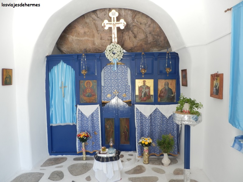 Resultó ser esta una preciosa cala con un pequeño muelle, las aguas tan transparentes como esperábamos y un marco estupendo donde pasar la mañana nadando, buceando y del agua a la toalla y viceversa, además al llegar temprano estábamos casi solos y poco a poco fue cogiendo ambiente sin que llegara a ser excesivo. Cuando nos apeteció y el sol comenzaba a apretar en serio buscamos refugio en la Cueva de Antiparos (a unos 3 kms de la cala), un lugar ideal donde refrescarse de forma natural, la entrada cuesta 5 € y se baja una cantidad de escalones considerables hasta llegar a la parte más profunda visitable, convenientemente iluminada y con presencia de estalactitas y estalagmitas. A la salida (o entrada) hay una pequeña iglesia decorada y pintada al estilo clásico de las Cícladas que por lo menos ese día estaba abierta y fue digna de visitarse. La panorámica desde arriba también merece la pena y en un día tan despejado era espléndida, con la hermana mayor, Paros, como telón de fondo.