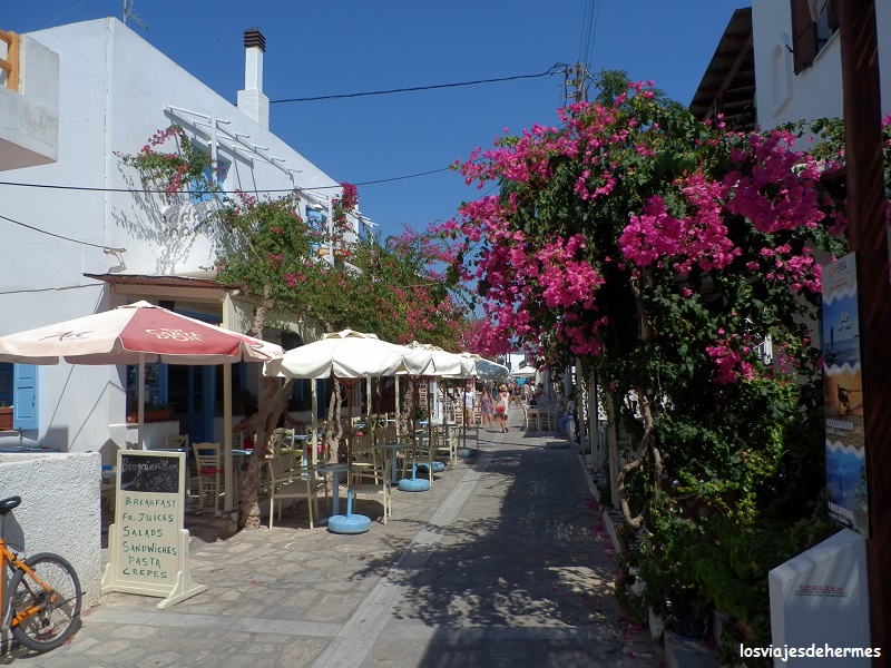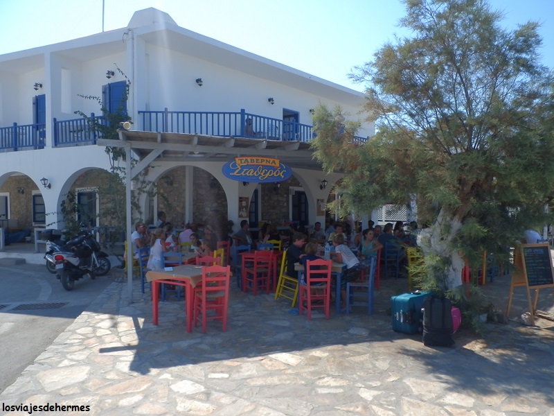 Regresamos a la capital, Antiparos, por 8 kms de caminos secundarios (estrechos pero asfaltados, atravesando también la villa de Kampos) encontrando aparcamiento al inicio del paseo junto al puerto, que es la zona donde empiezan las tabernas y los restaurantes, sin tardar mucho en decidirnos (es lo que tiene el hambre), de hecho nos quedamos en el primero que hacía esquina y de nombre sólo griego, el “Σταθερός”, muy colorido y donde probamos el pulpo tan típico de la región junto a unas albóndigas por 18,50 € los dos.