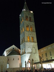 La ciudad de Zadar no es de las más visitadas de la costa croata, pero merece la pena hacerlo. Tiene unos 85.000 habitantes y un pasado agitado, como todo el país, fue romana, veneciana, húngara, austriaca… entre otros. Por desgracia también fue bombardeada y dañada en la II Guerra Mundial y en la de Yugoslavia. Su casco histórico está muy recogido en una pequeña península, es fácil encontrarlo y para aparcar, mejor en los alrededores, donde hay multitud de parkings a una media de 7 HRK=0,93 € la hora. Pasear por el centro es agradable, destacan los restos romanos junto a la iglesia de San Donato, la catedral y dos obras modernas, el saludo al sol (un panel solar que al atardecer se ilumina y va cambiando de color) y el órgano del mar (unos orificios en el muelle que al entrar las olas emiten diferentes sonidos). Ver la puesta de sol desde aquí es una buena opción, pues están situados en un extremo de la península que da al mar y la panorámica es de foto. Tras el atardecer el saludo al sol empieza a iluminarse al igual que los demás monumentos, nosotros paseamos tranquilamente por la zona y cenamos en una hamburguesería antes de regresar a “casa” después de un largo día.