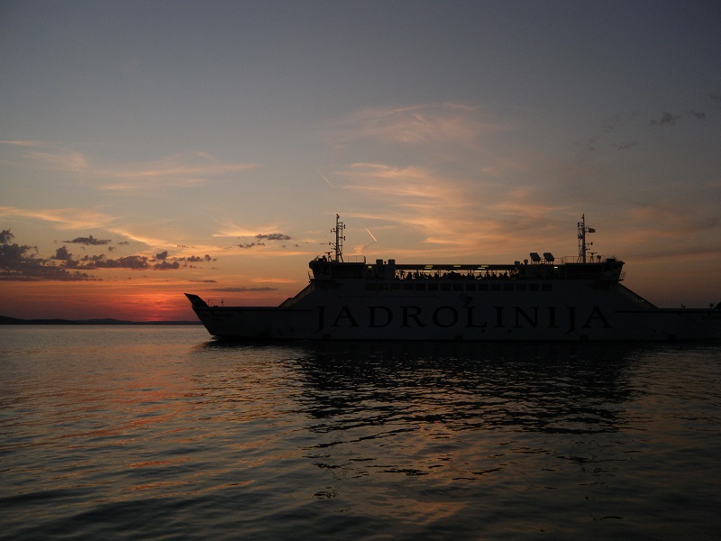 Tras levantarnos temprano y salir para ver un poco la zona de día, desayunamos y cambiamos algo de dinero en una casa de cambio a 1 €=7,35 Kunas croatas (KN ó HRK). Nos separaban de Zadar unos 240 km, uno de los días que más distancia recorreríamos, pero sin prisas, desde luego. El día era espectacular y las vistas desde la ctra. 8, pegada a la costa, más si cabe. La verdad es que apetecía meterse en el agua en cada rincón. Recorrimos el camino con tranquilidad y parando varias veces. Atravesamos diferentes pueblos hasta Prizna, donde cruzábamos a la isla de Pag en el ferry de Jadrolinija (la web se puede ver en inglés), compañía de la que dependen casi todas las comunicaciones marítimas croatas, que con tantas islas son de vital importancia. Nos costó 108 HRK=14,50 € (coche más dos personas), y en pocos minutos desembarcamos en Zigljen (Pag).