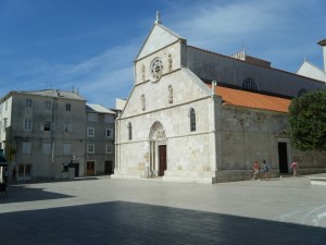 El paisaje cambia radicalmente en esta isla, pues apenas tiene vegetación y todo es piedra y más piedra. Tiene forma alargada y al sur está comunicada con un puente, por lo que no es necesario coger otro barco. La carretera que la cruza es la 106. Al norte pasamos Novalja, que se está haciendo famosa por las fiestas de sus playas, tipo Ibiza. No estuvimos para comprobarlo y seguimos camino hasta Pag, donde comimos por menos de 134 HRK=18 € en el “Bistro Na Tale”, una típica “konoba” croata (restaurantes familiares), lugar que aparece en la guía y donde pudimos probar el famoso queso de Pag, que es fuertecillo. Caminamos por el pueblo para bajar la comida y con un sol de justicia. Desde luego el pueblo es entrañable y bonito, a la vez que tranquilo y pequeño.