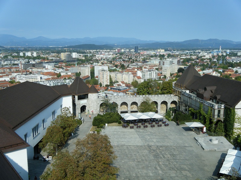 Comimos sencillo, vimos los puestos que estaban junto al puente triple y subimos al castillo pagando 4 € cada uno (6 € si se quiere utilizar el funicular), disfrutando de las vistas de la ciudad, y visitando una interesante exposición que cuenta la historia de la ciudad y del país, con un apartado especial para “la guerra de los diez días” tras la cual Eslovenia se independizó en 1991. De camino al hostal visitamos los restos de la muralla romana. Nos llevamos una grata impresión de la ciudad, de lo cuidada y limpia que está y de la tranquilidad que se respira.